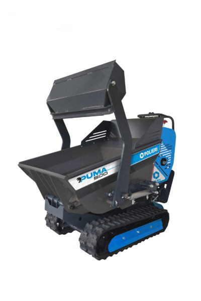 La gama de mini dumpers de Polieri incluye modelos como el Puma 600 y el Puma 800, cada uno adaptado a diferentes necesidades del sector de la construcción. El Puma 600, por ejemplo, es un dumper cingolato (con orugas) que ofrece un sistema de descarga frontal, ideal para el manejo eficiente de materiales en el sitio de trabajo. Con una capacidad de carga de hasta 600 kg, este modelo es perfecto para tareas que requieren transportar grandes volúmenes de material de manera rápida y segura.